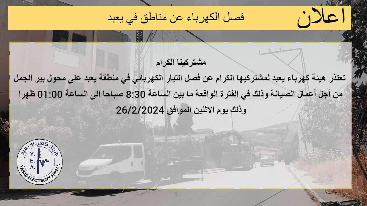 مشتركينا الكرام تعتذر هيئة كهرباء يعبد لمشتركيها الكرام عن فصل التيار الكهربائي في منطقة يعبد على محول بير الجمل من أجل أعمال الصيانة وذلك في الفترة الواقعة ما بين الساعة 8:30 صباحا الى الساعة 01:00 ظهرا وذلك يوم الاثنين الموافق 26/2/2024